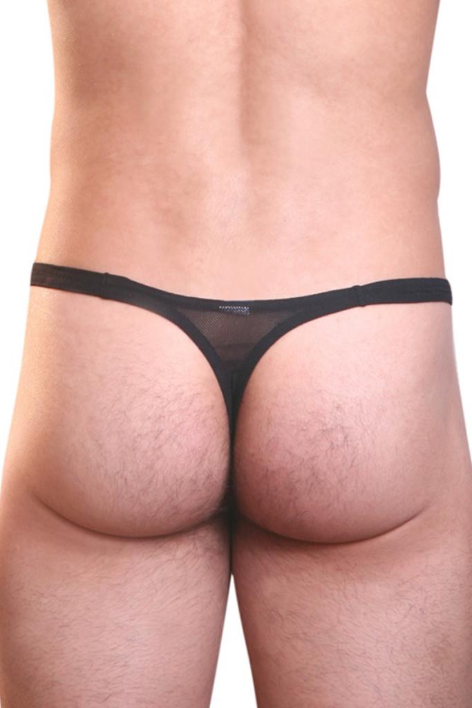 Schwarzer String-Tanga für Männer von LOOK ME. Für das Produkt wurde ein feines, dehnbares, blickdichtes Netz-Material verwendet.
