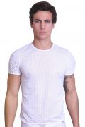 Weißes T-Shirt für Männer von LOOK ME. Das Shirt besteht aus einem dehnbaren Netzmaterial. Am linken Ärmel befindet sich eine dekorative Schnürung.